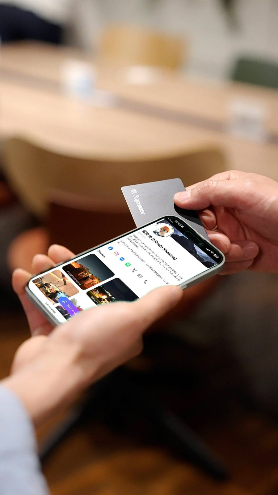 遊びと仕事の境界線を無くすスマート名刺。スマートフォンにカードをタッチするだけで、仕事、副業、趣味、SNSアカウントから提案資料まであらゆる情報を一瞬で共有できます。